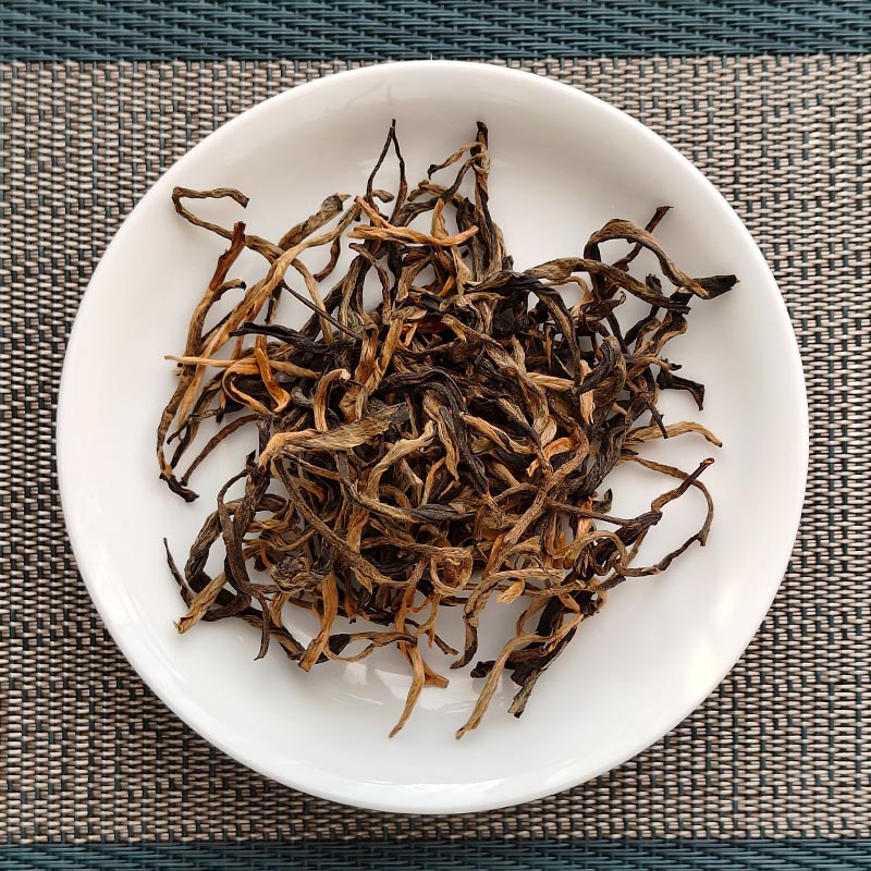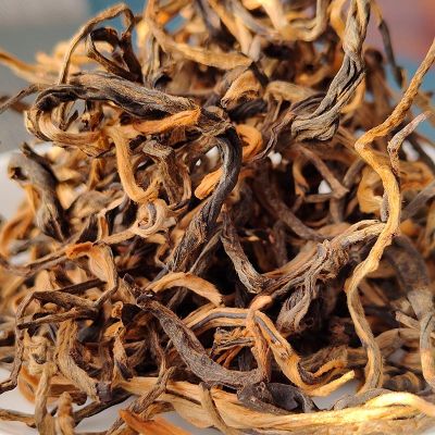 Сухой чай тёмный, блестящий, скрученный, с золотистыми ворсинками.