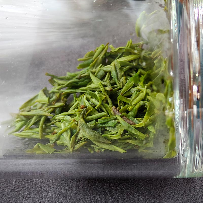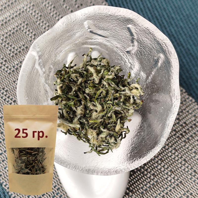 Отборное сырье собрано до праздника Цинмин. Чай изготовлен вручную мастером высокого класса, имеющим многолетний опыт. Чаинки имеют одинаковый размер и аккуратный, опрятный внешний вид. Сухой лист обильно покрыт белыми ворсинками, что указывает на молодость и свежесть сырья (осторожно, ворсинки легко разлетаются из пакета и могут стать причиной чихания). Чайные ворсинки придают настою тот самый сладкий вкус и ощущение свежести.
