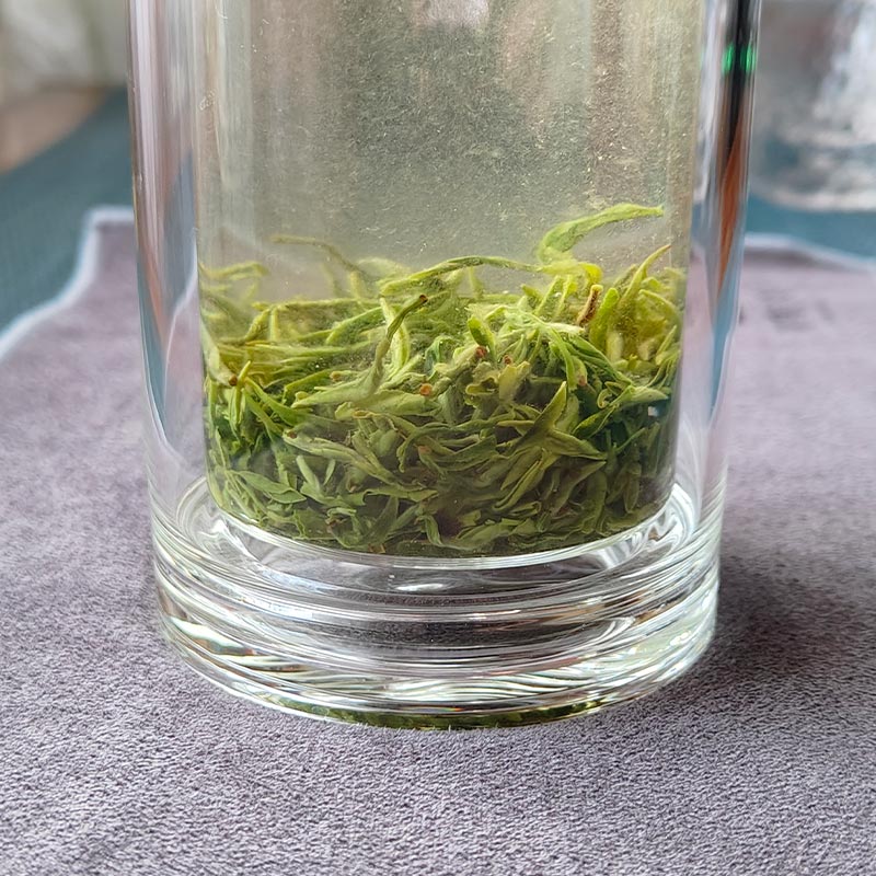 Сухой лист состоит из скрученных, небольших почек, обильно покрытых пухом. Производитель называет свой чай "Би Ло Чунь". Да, имеется визуальное сходство с сортом Би Ло Чунь именно благодаря форме сухого листа, обилию чайных ворсинок, золотисто-зеленому, слегка мутному настою. Но, технически, это Мэндин Гань Лу, и дело здесь в другом терруаре, технологии производства, а, следовательно, в ароматическом профиле.