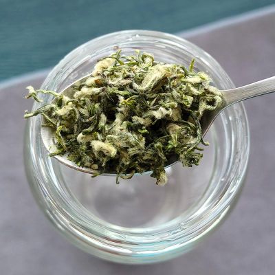 При заваривании чайные почки опускаются на дно, они крепкие, тучные и имеют свежий зеленый цвет.