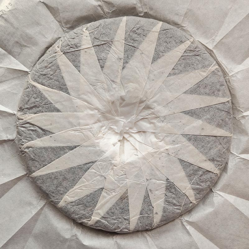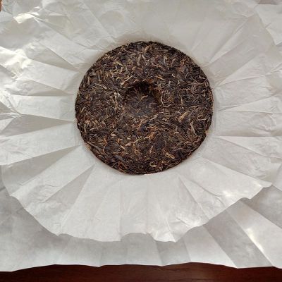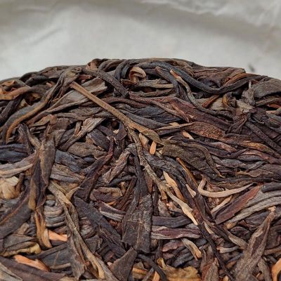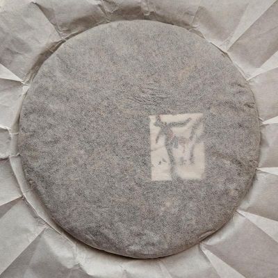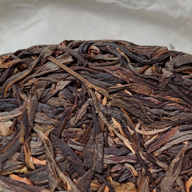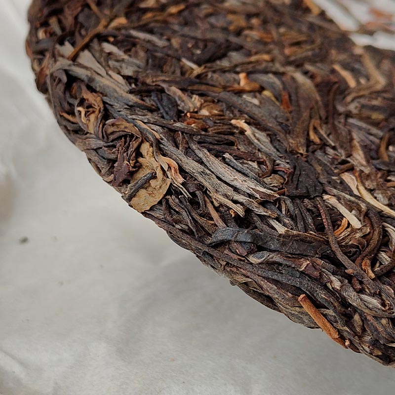 Форма чая округлая и цельная, плотность прессовки умеренная; чаинки толстые и крепкие, ровные и упорядоченные, тёмно-зелёного цвета с коричневато-бурым оттенком, видны белые ворсинки, ощущается лёгкий чайный аромат.