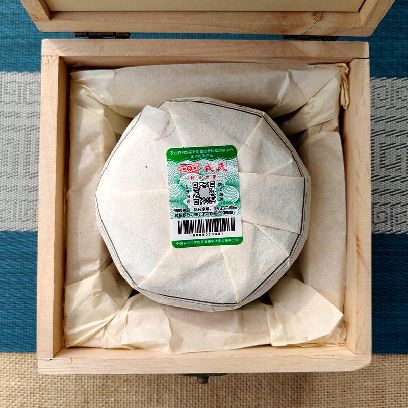 Чай спрессован в 600-граммовую колонну-тыкву и традиционно уложен в деревянную коробку.